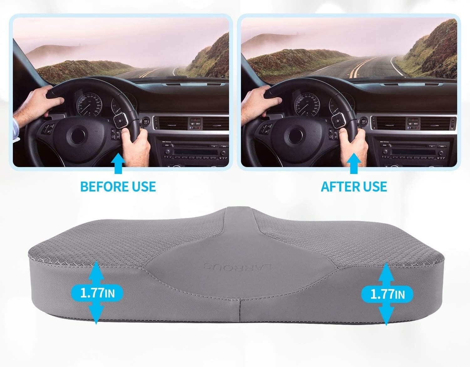 LARROUS Seat Cushion is designed to increase the height of your car seat, especially at the rear, providing perfect lumbar support. The fabric is made of ice mesh eye breathable material. It has the characteristics of a warm winter and cool summer feeling.